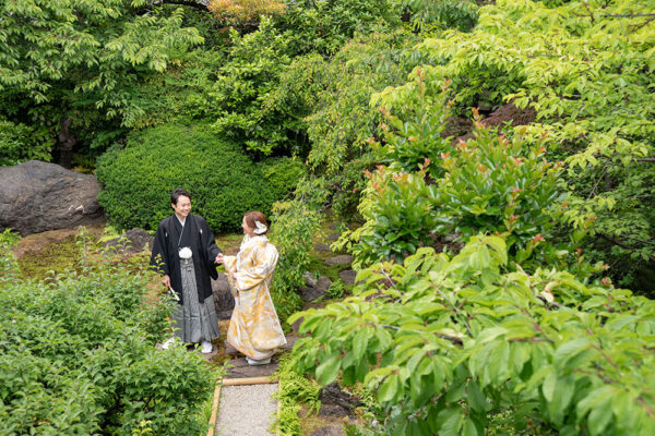 当料亭では、伝統的な神前式から人前式(室内・庭園)まで、お二人の願いを形にする挙式をご提案します。そして、自然光が差し込む美しい会場では、和モダンな空間をバックに、ゲスト全員が特別な瞬間を共有できます。四季折々の日本庭園を眺めながら、ここでしか体験できないウェディングを。