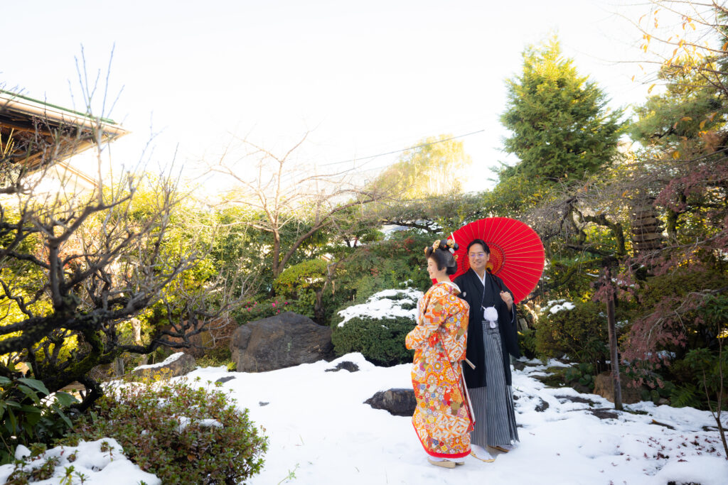 おすすめ演出:庭園にうっすらと雪が積もる日には、白無垢や色打掛がより一層映える幻想的な撮影