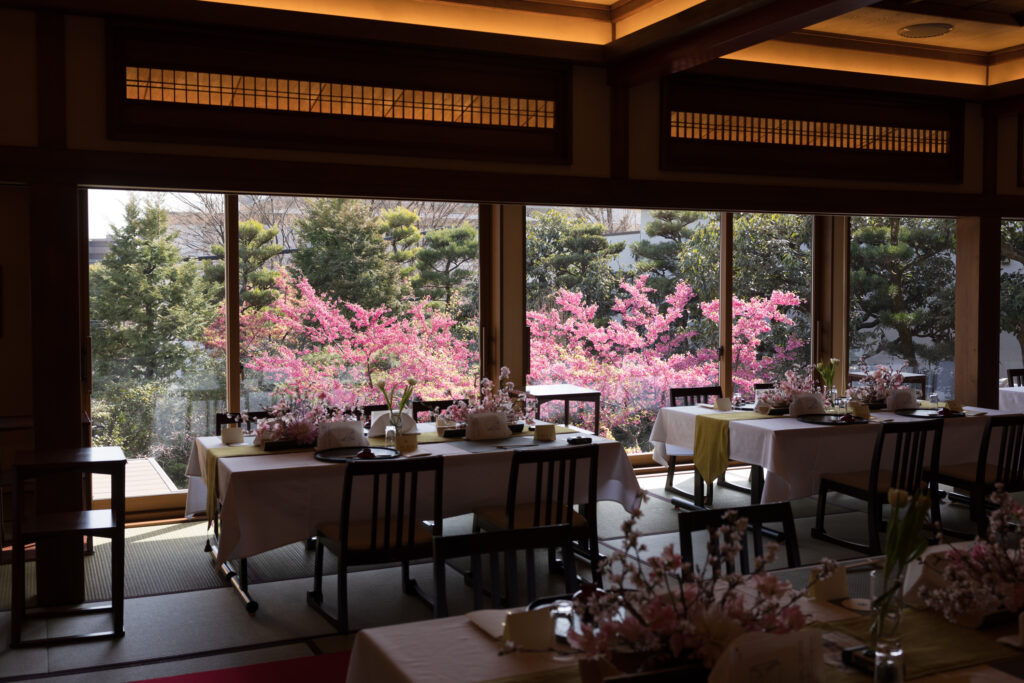 上階は“俯瞰の気持ちよさ”。季節の主役(梅・桜・新緑・紅葉)が面で広がり、庭そのものの設計意図が見えてきます。30名以上の披露宴会場として使用します。
