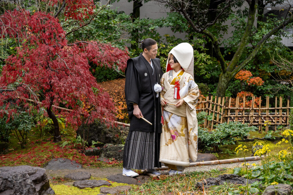 白無垢の白さが紅葉に映え、色打掛の鮮やかさも紅葉と美しく調和します。か茂免の落ち着いた庭園との相性もよく、前撮り・後撮り・当日撮影どれも美しい仕上がりに。